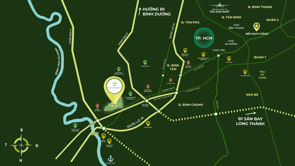 Dự án Eco Retreat nằm tại cửa ngõ phía Tây Sài Gòn, cách bến Bạch Đằng 30 phút di chuyển theo Đại lộ Võ Văn Kiệt – cao tốc TPHCM – Trung Lương.